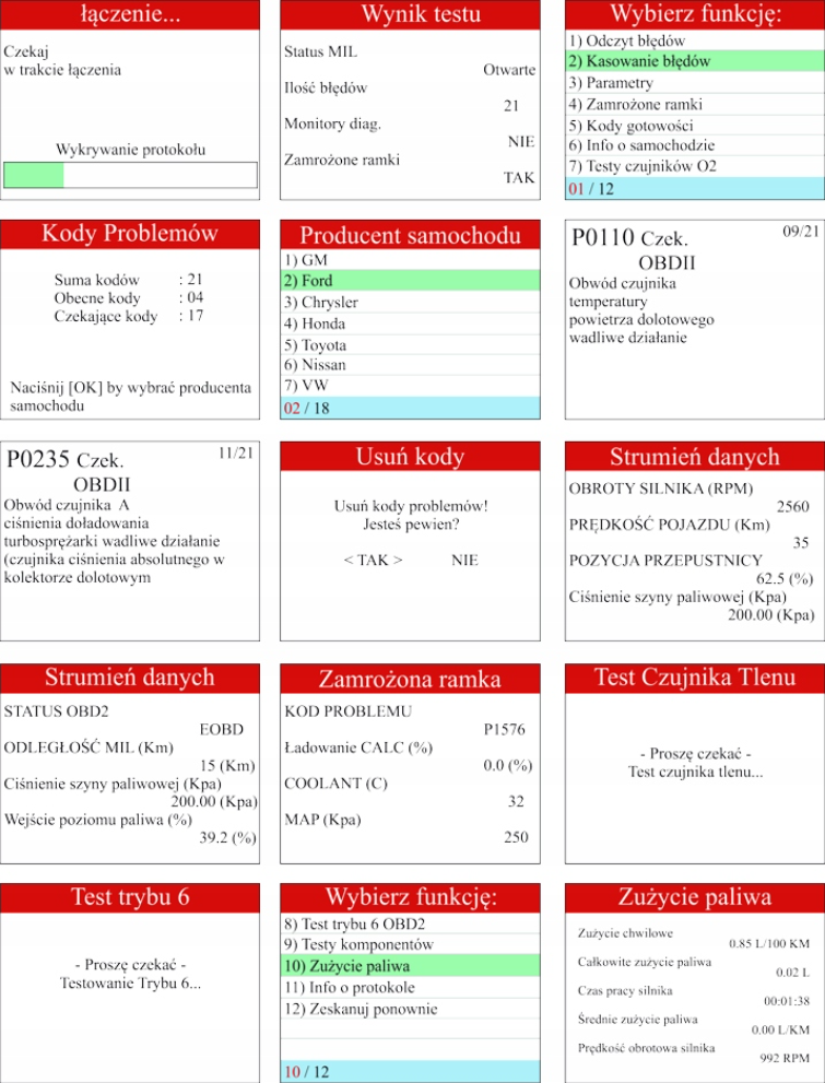 - Obs艂uga wszystkich pojazd贸w zgodnych z OBD2.